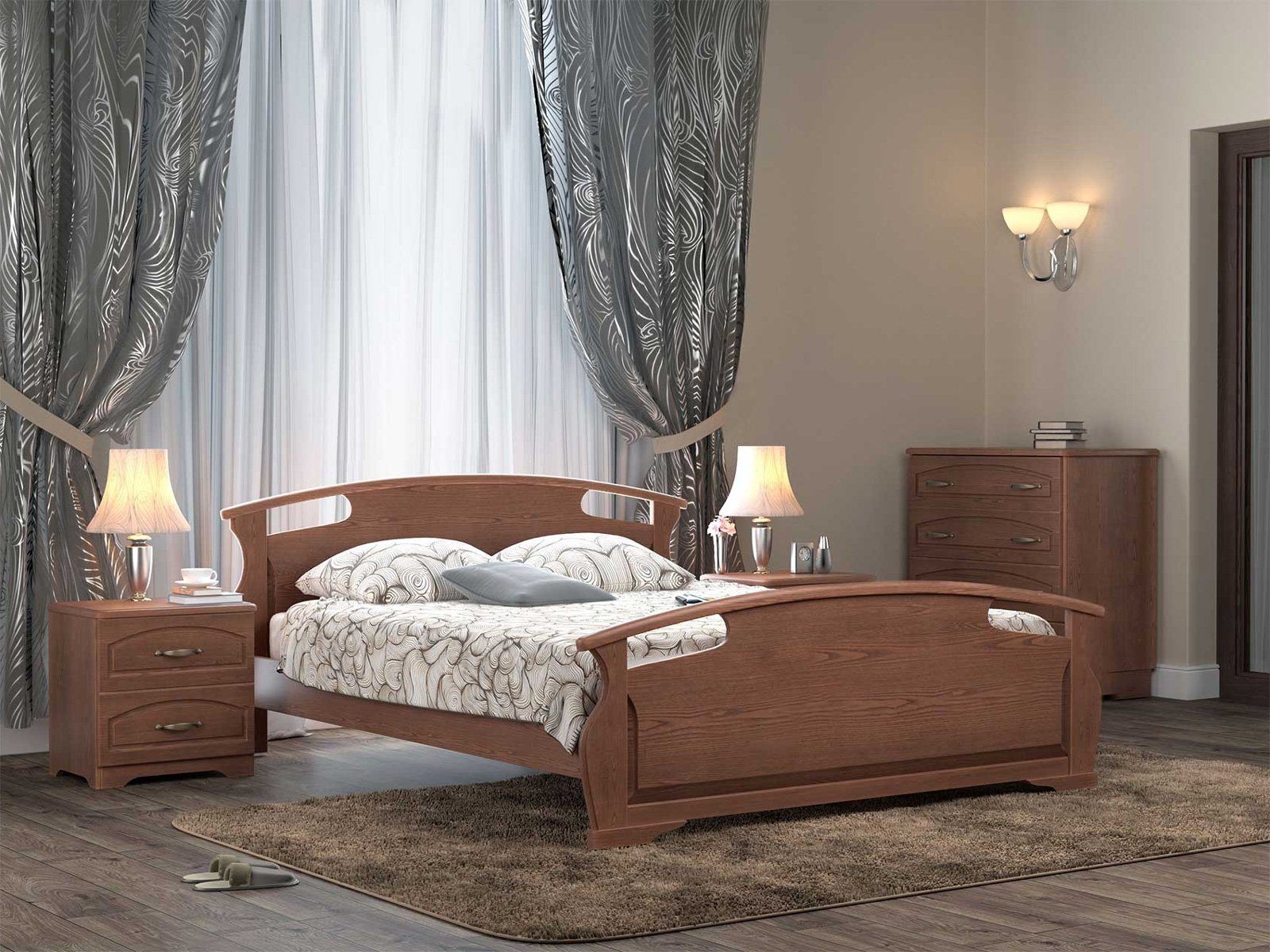Двуспальная шикарная кровать Афродита из массива бука с высоким изножьем - это лучший выбор для Вас и Вашей семьи. Сложные гнуто-клееные элементы декора кровати, превосходно впишутся в любой интерьер. Кровать из массива ценной породы дерева – бука - гарантия экологической чистоты в Вашем доме. Такие кровати отличаются долговечностью и надежностью. Вся мебель покрывается высококачественным полиуретановым лаком (Испания), что защищает поверхность от царапин и прочих повреждений.