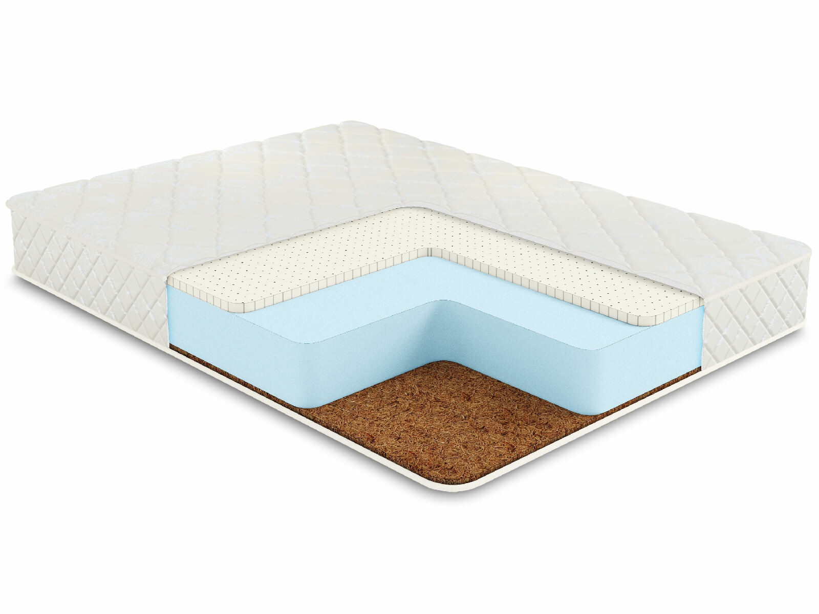 Обе спальные поверхности представлены природным наполнением. Более мягкая сторона представлена нежным и очень комфортным латексом, а другая поверхность реализована с помощи койры – плиты выраженной жёсткости.