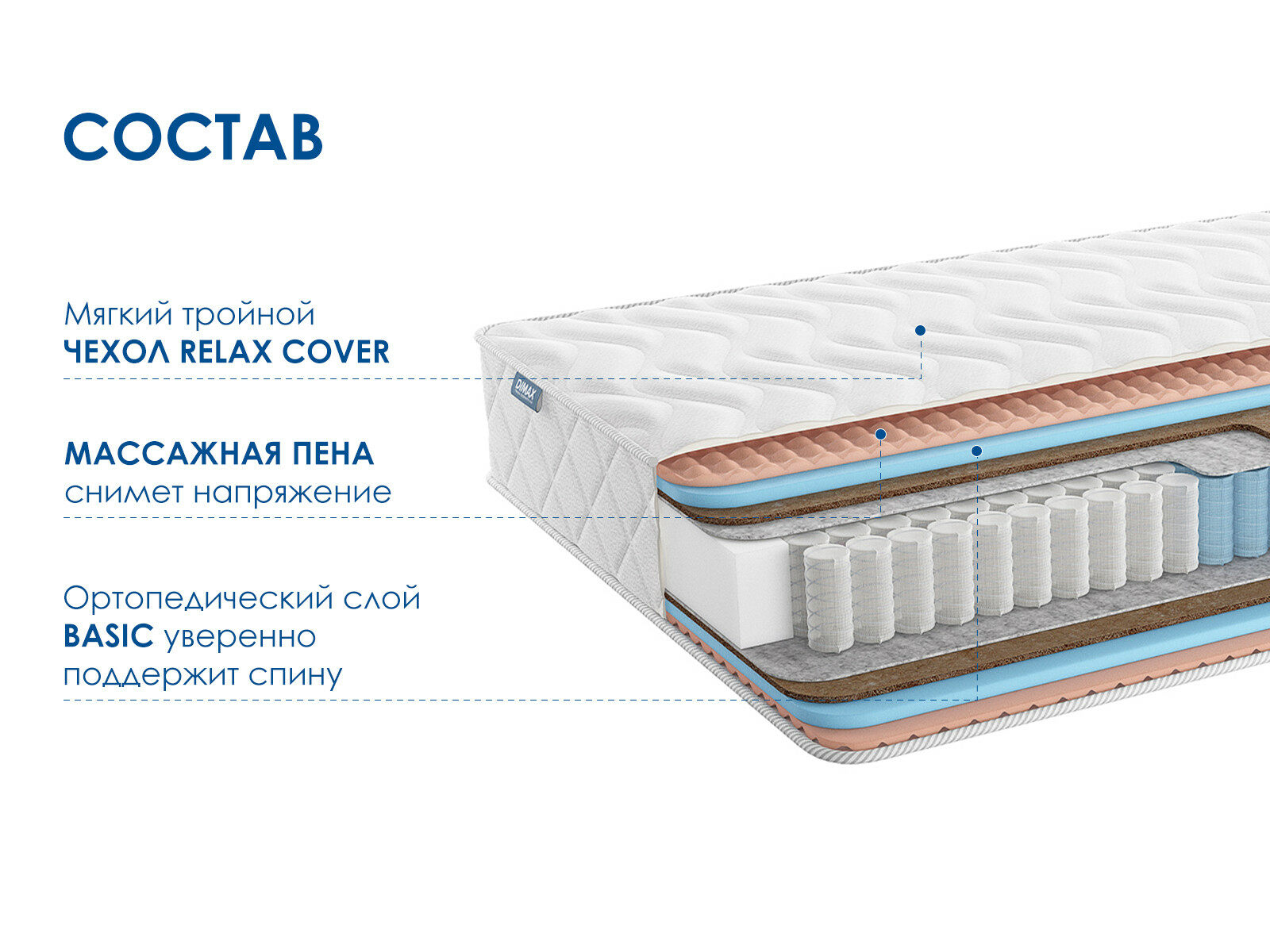 Массажный матрас Димакс Relmas Foam Cocos 3Zone – это удачное решение для тех, кто ценит умеренно жёсткие спальные поверхности с выраженным ортопедическим эффектом. Независимый пружинный блок и натуральные наполнители делают матрас долговечным и безопасным выбором.