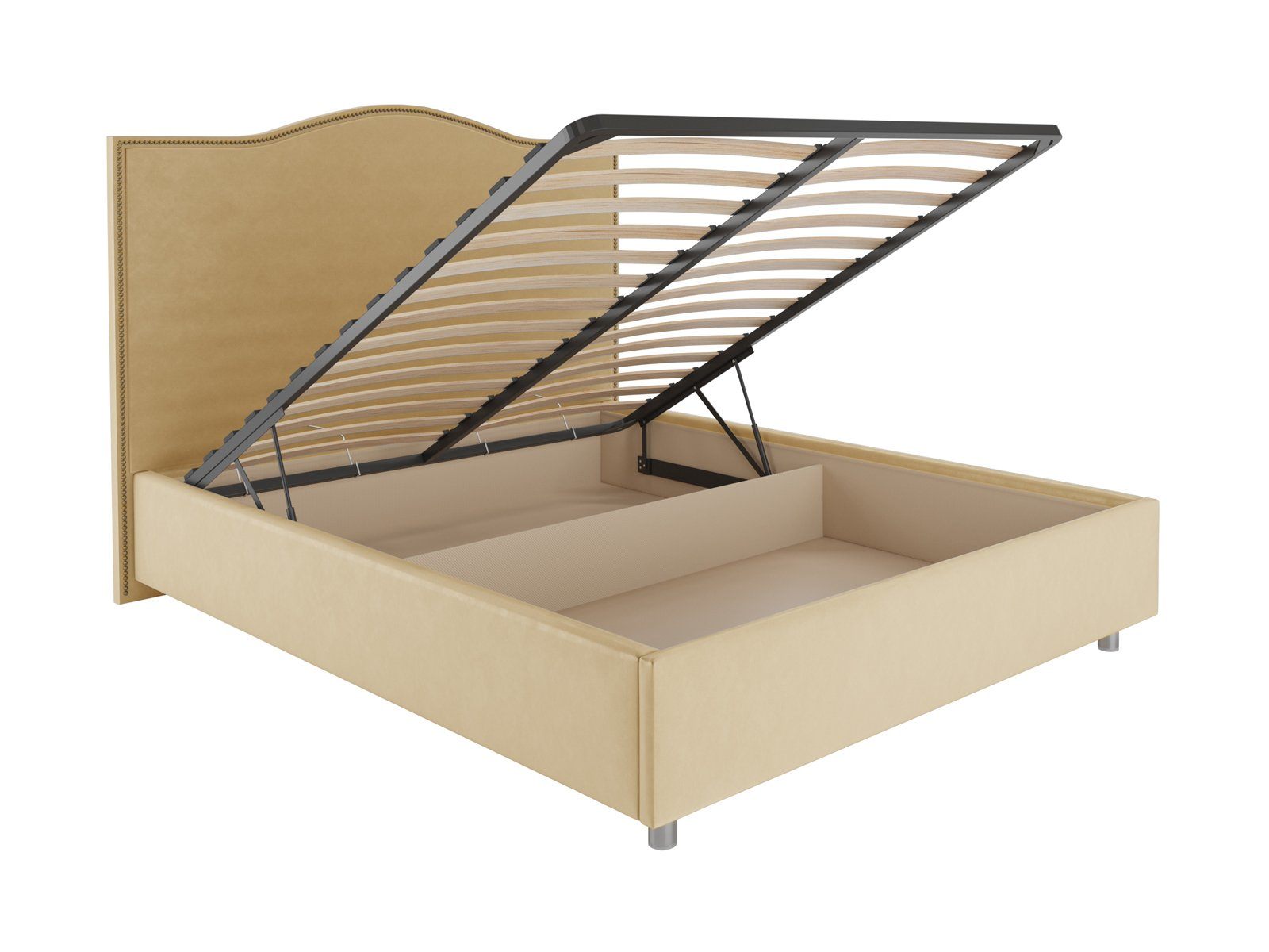 Кровать комплектуется металлическим основанием с подъемным механизмом, под которым находится вместительный бельевой ящик для хранения сезонных вещей и постельных принадлежностей.