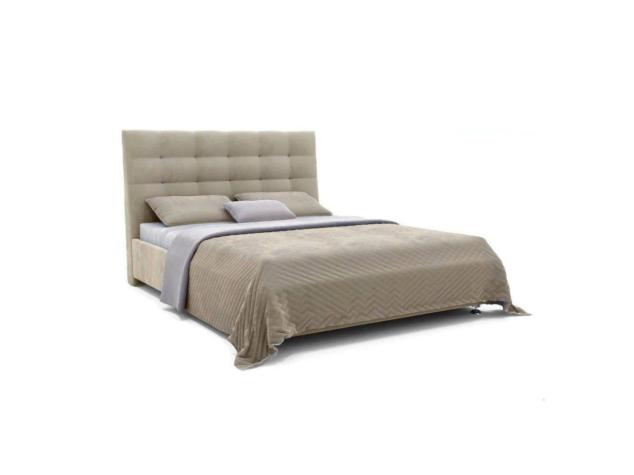 Современная модель среди интерьерных кроватей. Оригинальный рельеф изголовья, выполненный в виде квадратов с декоративной строчкой задает определенный ритм всему интерьеру спальни.