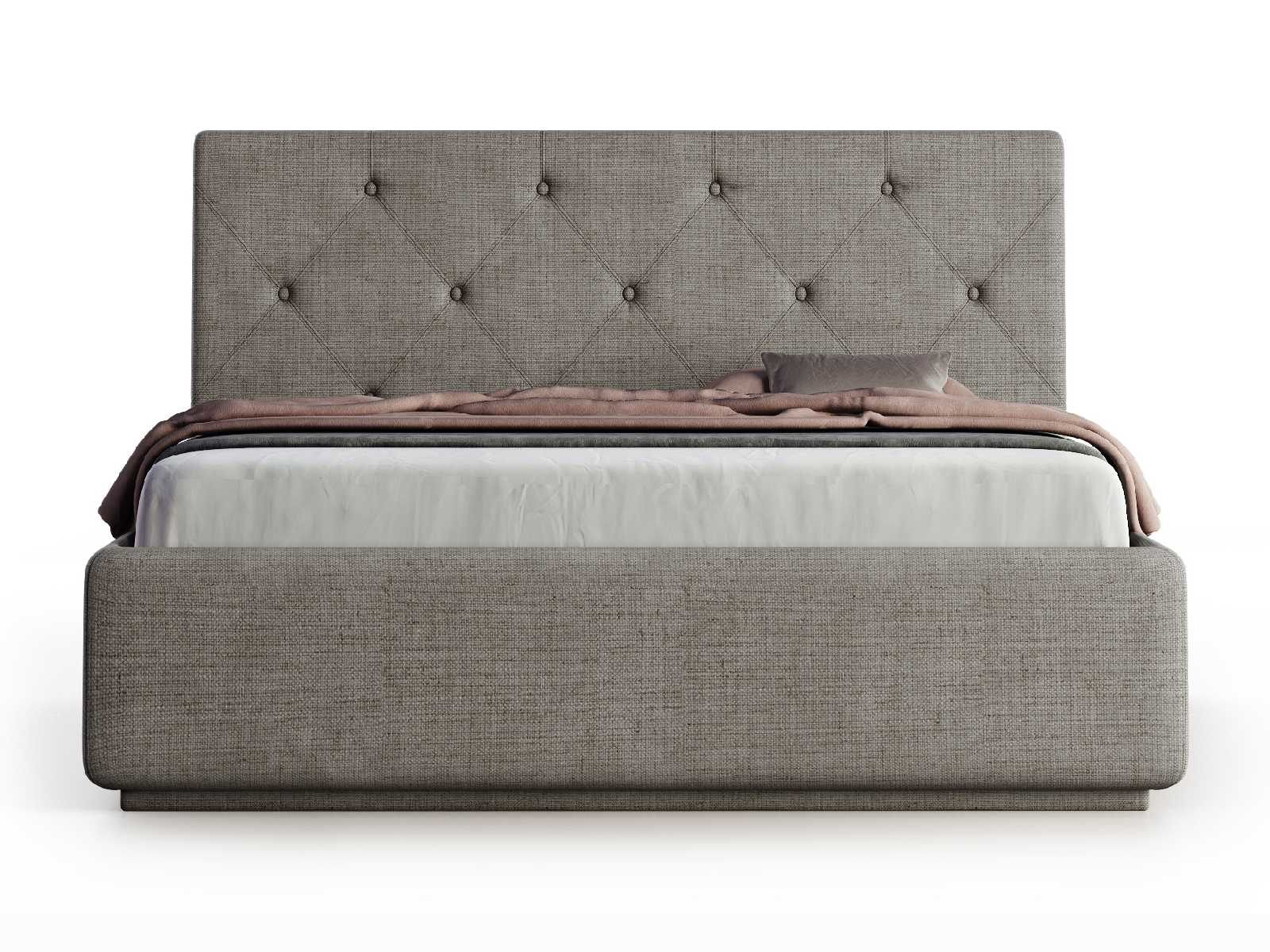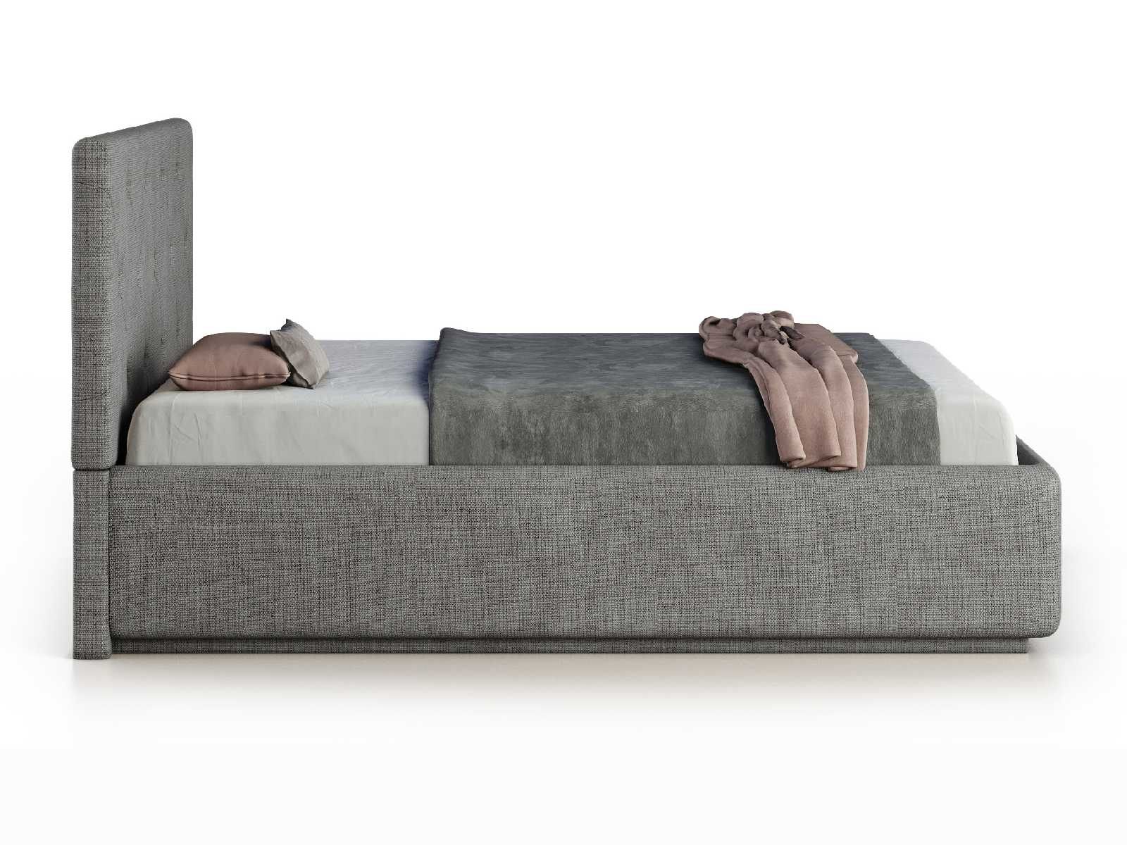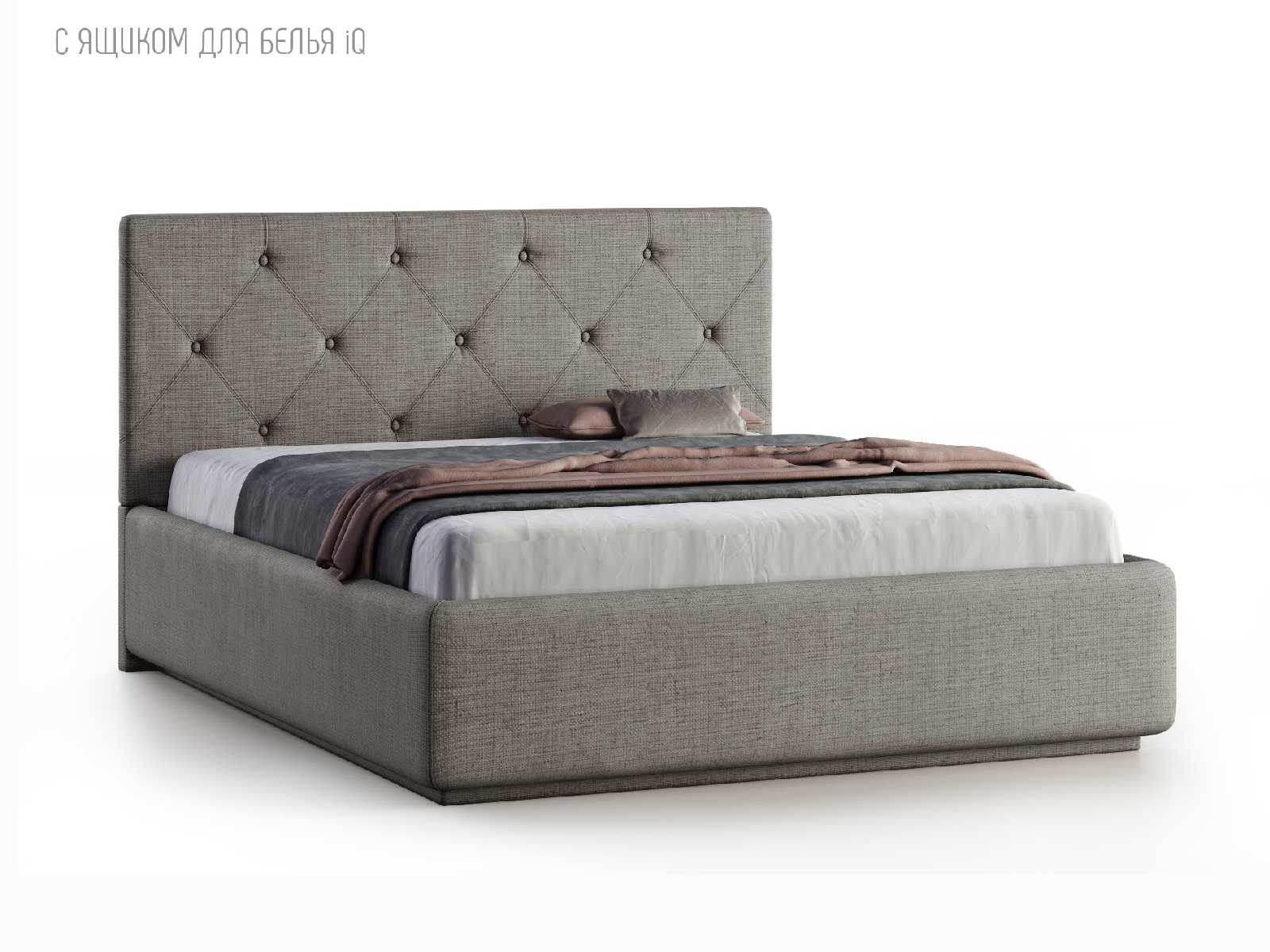 Кровать укомплектована IQ с подъемным механизмом и ящиком для белья без дна (дополнительная платная опция - дно к ящику IQ из HDF (ХДФ). Каркас кровати на цоколе, декоративный чехол на цоколе съёмный. Глубина ящика для белья - 30 см, без ограничения нагрузки на ящик.