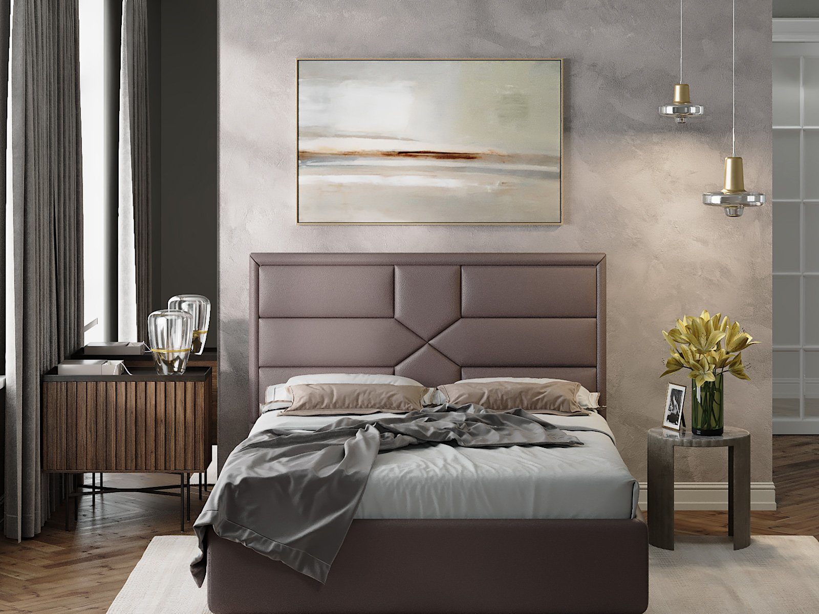 Изголовье состоит из мягких выпуклых панелей, идеально и ровно обтянутых тканью/экокожей, собранных в единый рисунок.