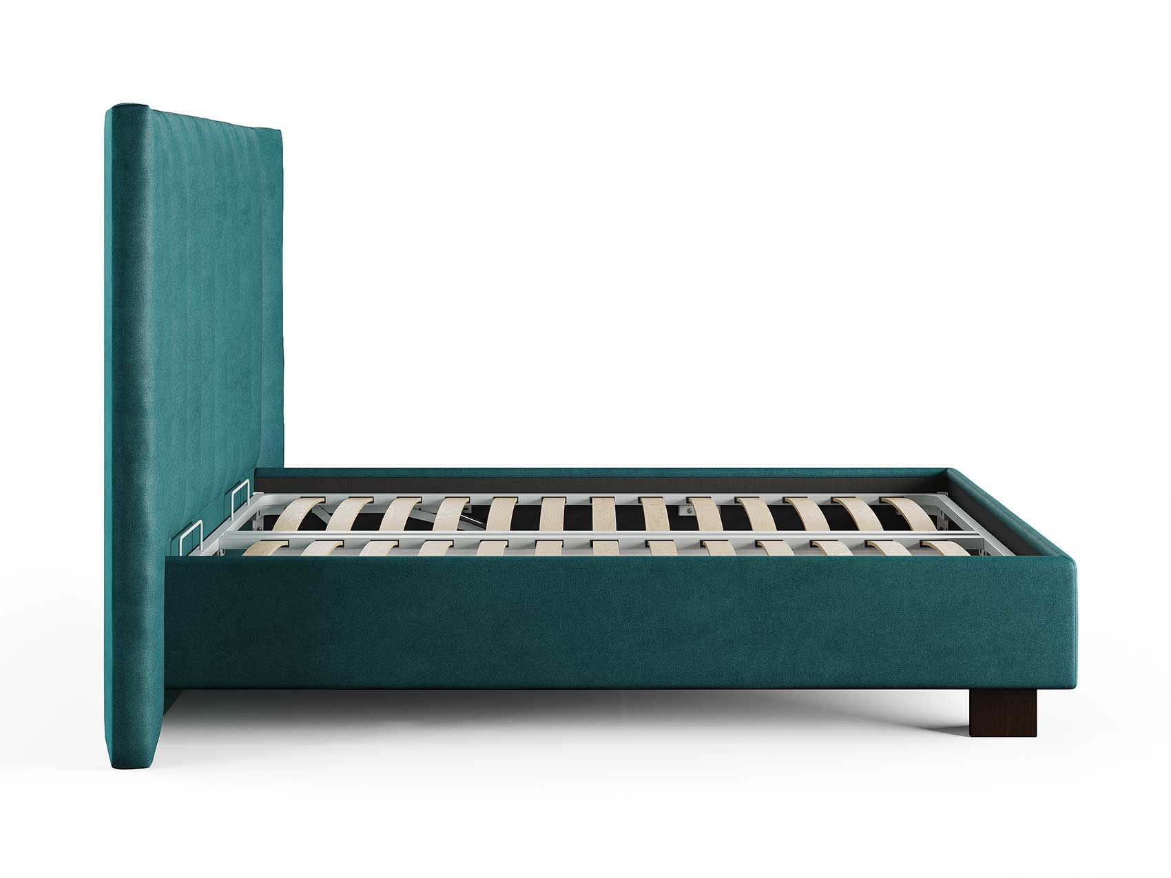 Кровать соответствует самым модным тенденциям и прекрасно впишется в современный интерьер просторной спальни. Высокая спинка с мягкими элементами выглядит эффектно. Поворотный механизм боковых элементов изголовья меняет форму, создавая более уютную атмосферу в спальне. Увеличенная прочность кровати достигается за счет металлического каркаса по периметру. Массивные ножки, выполнены из бука цвета венге. Расстояние от пола до царг способствует легкой уборке под кроватью, в том числе роботом – пылесосом. При желании возможно установить подъемный механизм с бельевым коробом либо трансформируемое основание Aquarius.
