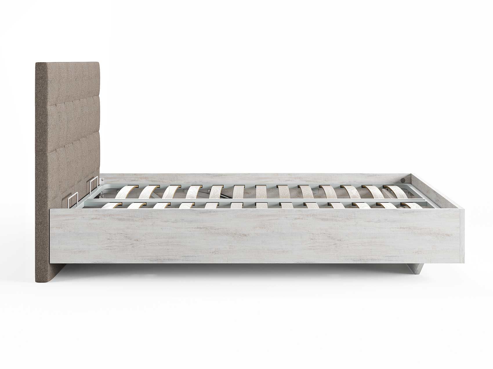 Кровать комплектуется металлическим основанием (без опор), которое имеет 13 рядов встроенных березовых ламелий на каждое спальное место, обеспечивая равномерное распределение нагрузки.