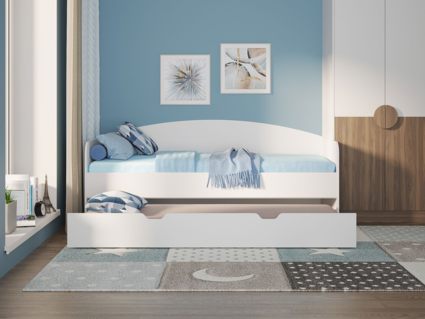 Кровать из ЛДСП с дополнительным выдвижным спальным местом. Выдвижная часть модели может использоваться в качестве дополнительного спального места или вместительного бельевого ящика. Модуль выдвигается с помощью роликов. Возможность полного выдвижения способствует легкой уборке под кроватью. Варианты исполнения: доступна в пяти цветах ЛДСП (белый, графитовый, ясень ориноко, ясмунд и ясень анкор)