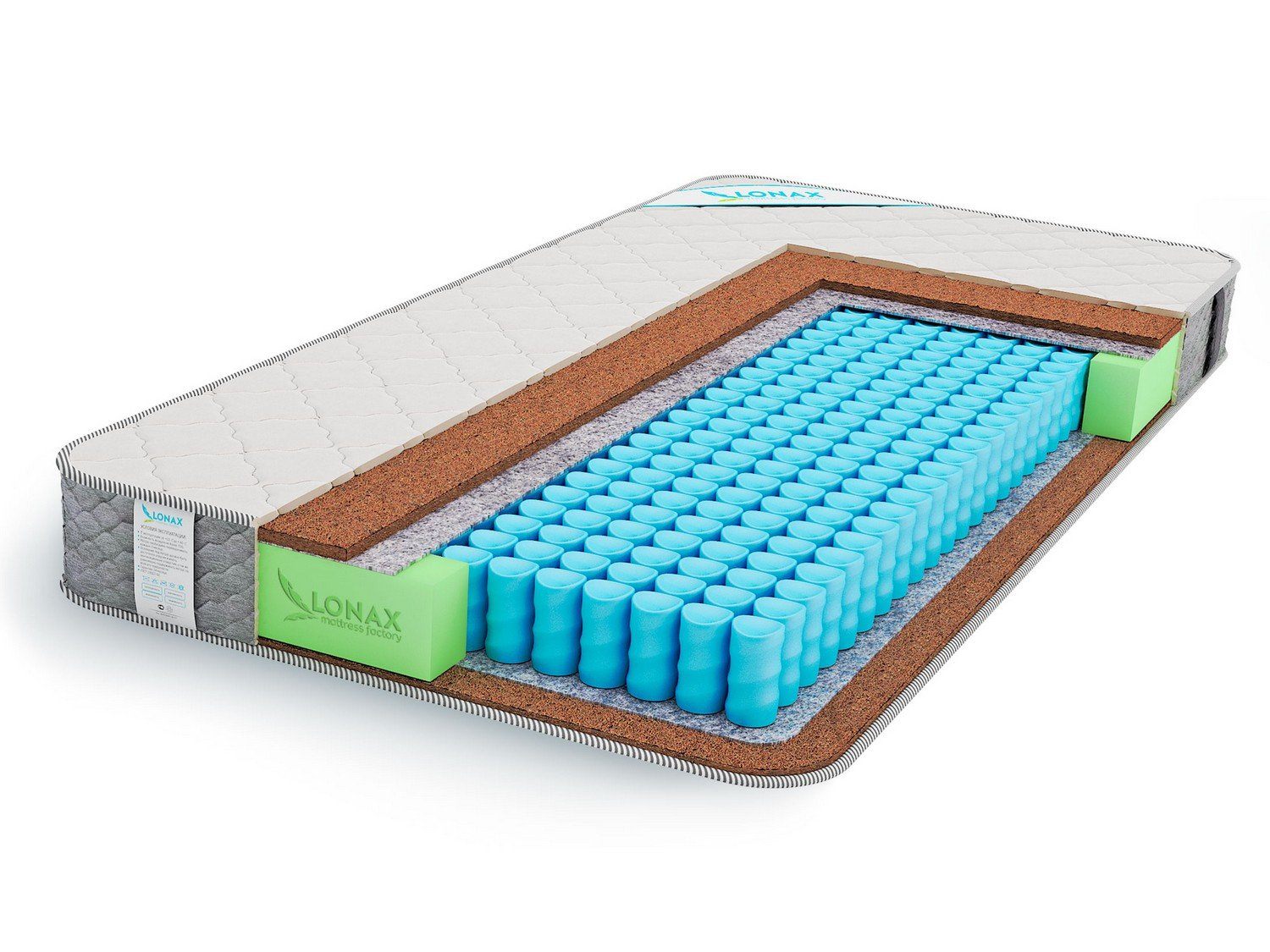 С каждой стороны от блока расположено по слою жесткой кокосовой койры. Это натуральный экологически чистый материал с отличной воздухопроницаемостью.