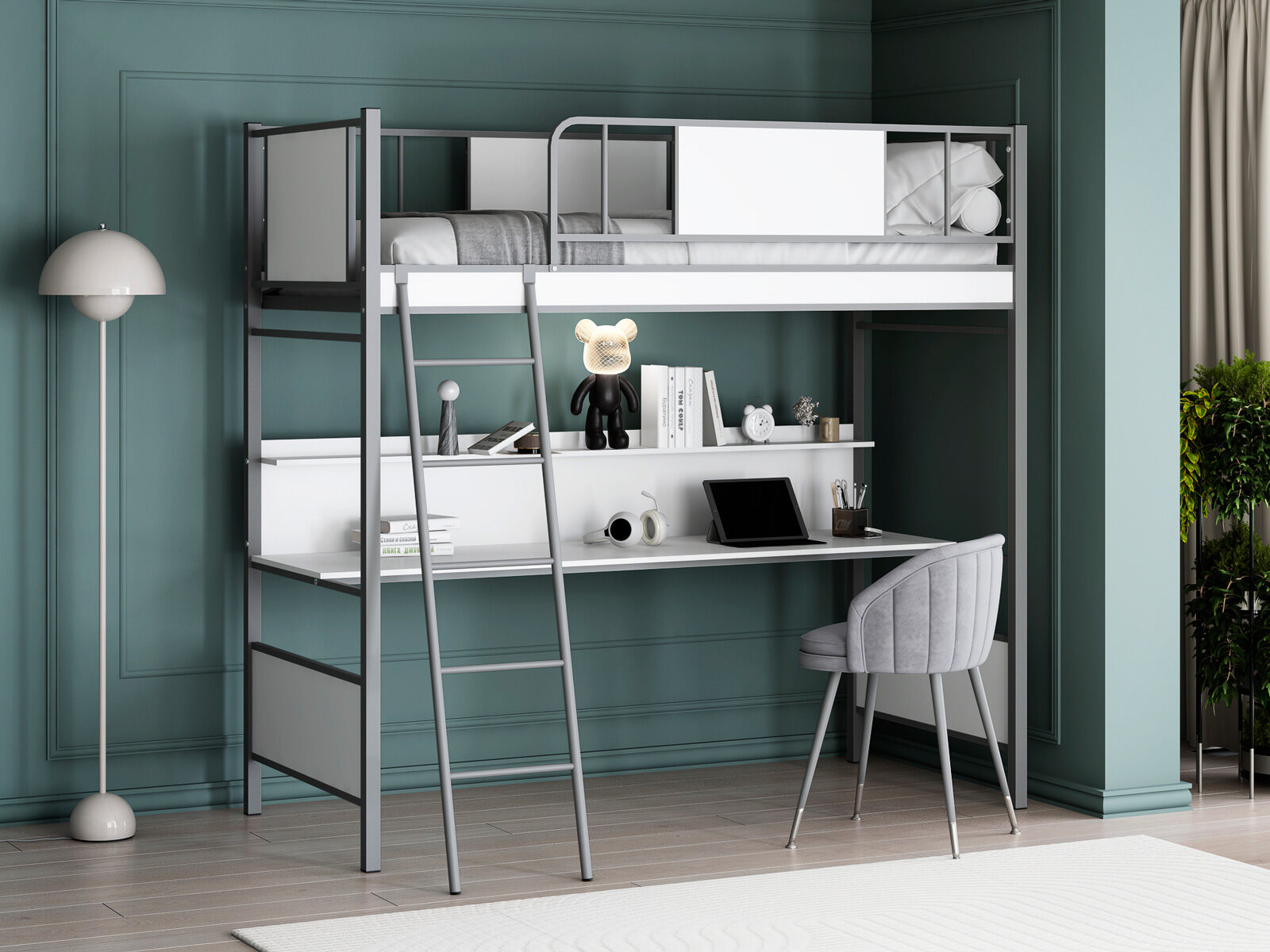 Модель оснащена столом с полками, что обеспечивает рабочее пространство для работы или учебы, а также металлической планкой под столешницей для дополнительной прочности.