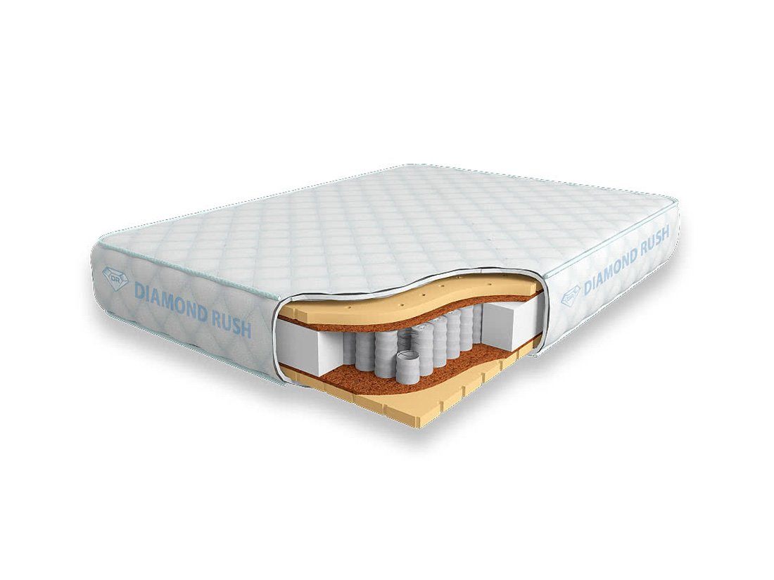 Матрас Diamond Rush Comfy 725DR имеет в своей основе независимый пружинный блок 725, состоящий из пружин диаметром 5-6 см. В качестве настилочных слоев поверх пружинного блока используются листы латексированной кокосовой койры, а также листовой перфорированный натуральный латекс. Стороны имеют одинаковую среднюю жесткость с обеих сторон.