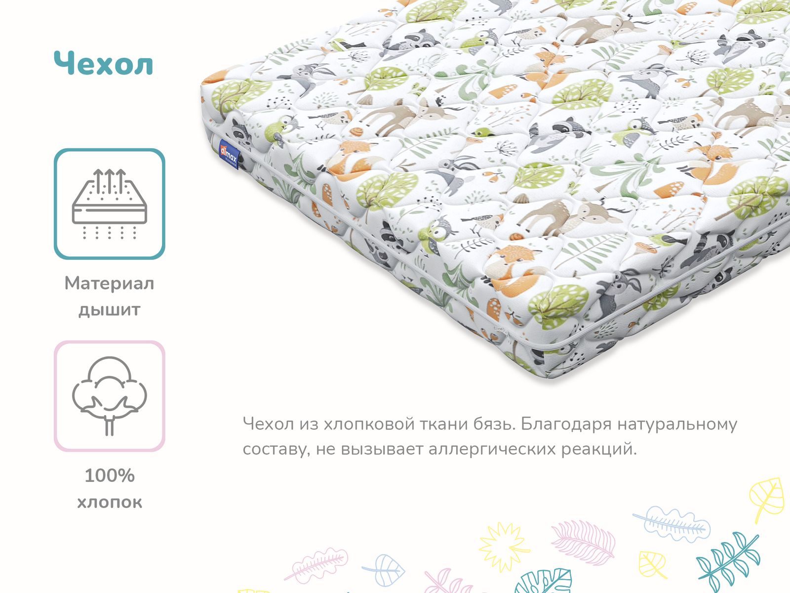 Димакс Очумелкин – это беспружинный детский матрас с двумя разными сторонами кокосовой и латексной. Такая конструкция позволяет родителям легко адаптировать матрас под потребности растущего ребёнка.