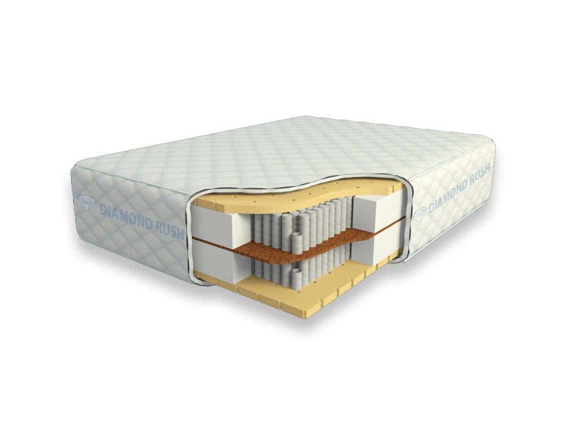 Модель Full Latex BigFoot 1440LD от компании Diamond Rush отличается двухуровневым пружинным блоком в своем составе и наличием натурального латекса в качестве наполнения. В основе изделия производителем были использованы два блока независимых пружин «Мультипакет», где на 1 кв. м. каждого из них помещается не менее 550 пружин высотой 13 см. Каждая пружинка в этом случае одета в специальный мешочек, чтобы оказывать точечную – ортопедическую поддержку пользователю. По всему периметру детали защищает специальный короб из пенополиуретана, который предотвращает деформацию краев матраса. Плюс ко всему между пружинными блоками проложен слой латексированного кокосового волокна толщиной 1 см, который не дает воздействовать пружинным блокам друг на друга, прорывать мешочки и деформировать структуру самих пружин.
