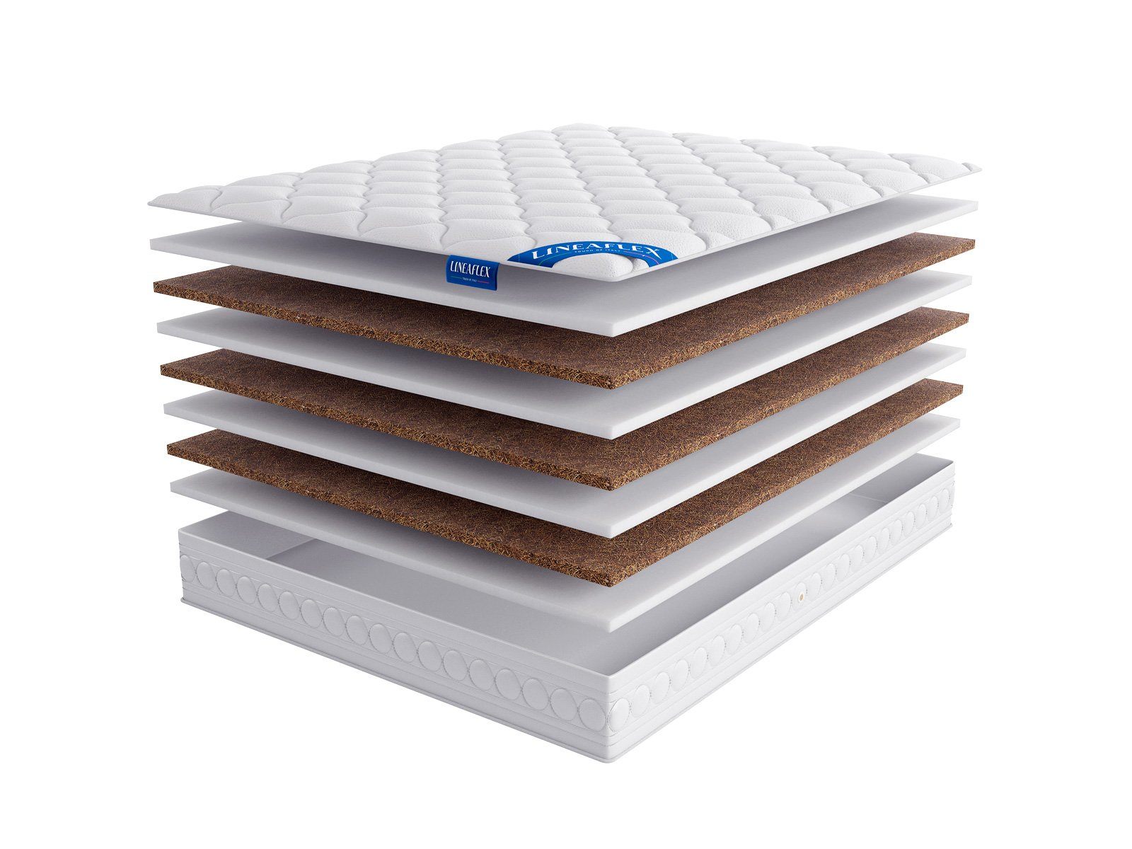 Матрас построен путём чередования двух видов материалов: ERGOFLEX и натуральной кокосовой койры. Если снять чехол, то сбоку такое изделие напомнить пышный слоёный торт, только «коржами» будут выступать прочная койра и мягка пена.