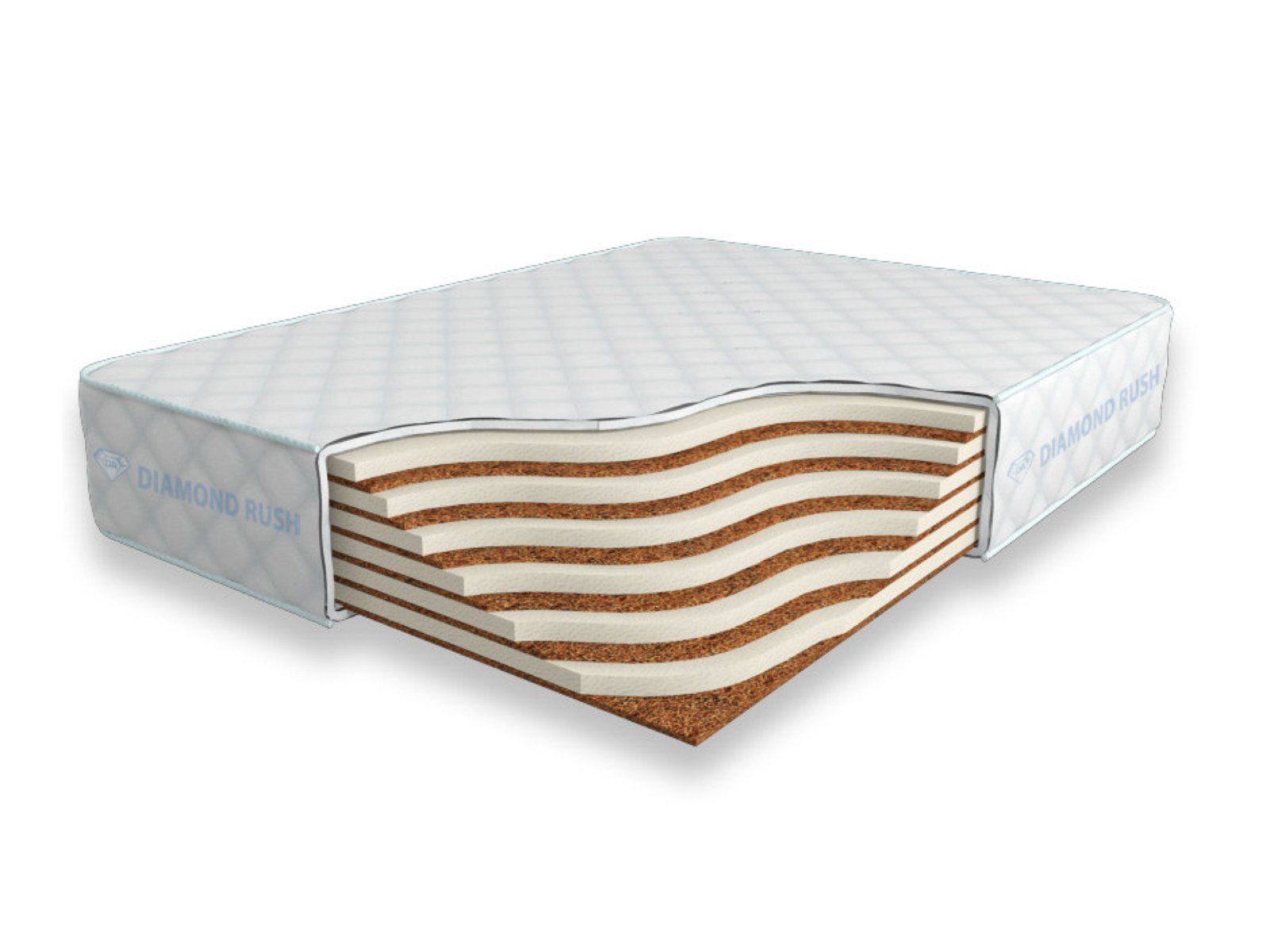 Матрас Diamond Rush Mix Cocos 24 SD не имеет в своей основе пружинного блока. В его состав входят одно или несколько чередований слоев латексированной кокосовой койры (1см) и искусственного латекса (3см). Такая модель матраса обладает средним ортопедическим эффектом и имеет разные по жесткости стороны.