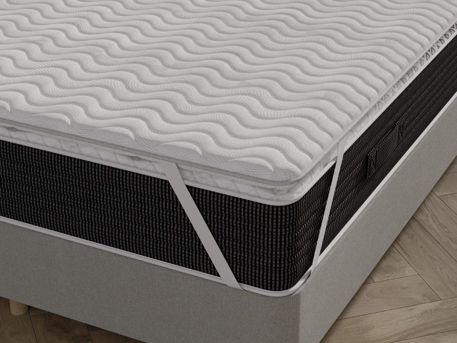 Топпер изготовлен из натурального латекса и кокосовой койры. Нижний слой выравнивает поверхность спального места, а более мягкий и комфортный верхний слой обеспечивает поддержку спины. Крепление осуществляется с помощью резинок по четырём углам.