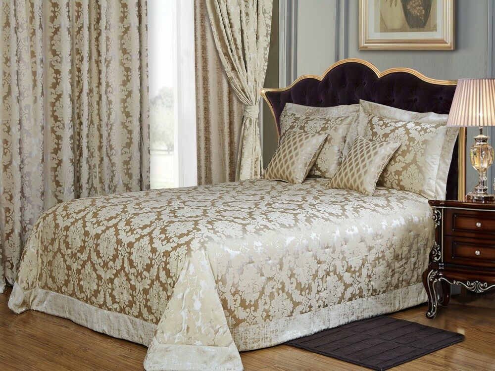 Роскошное покрывало с классическим итальянским рисунком бежевого цвета на теплом золотистом фоне.