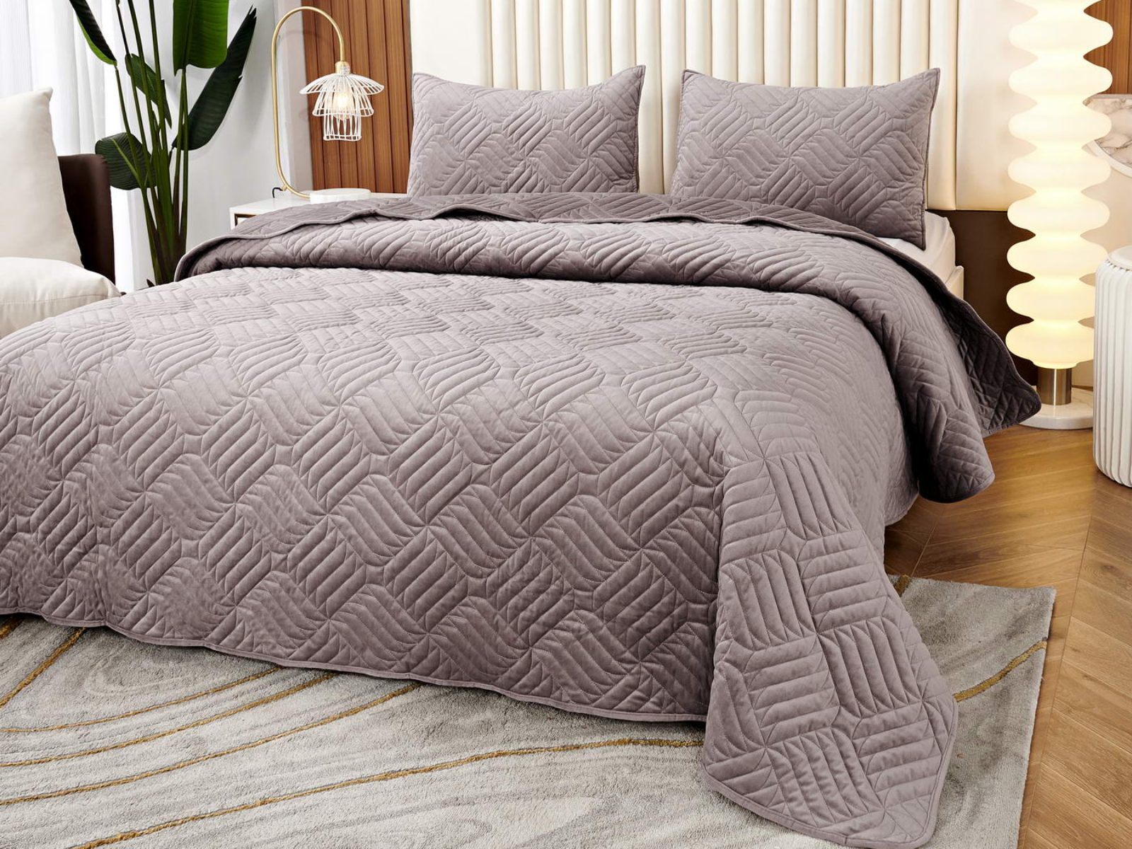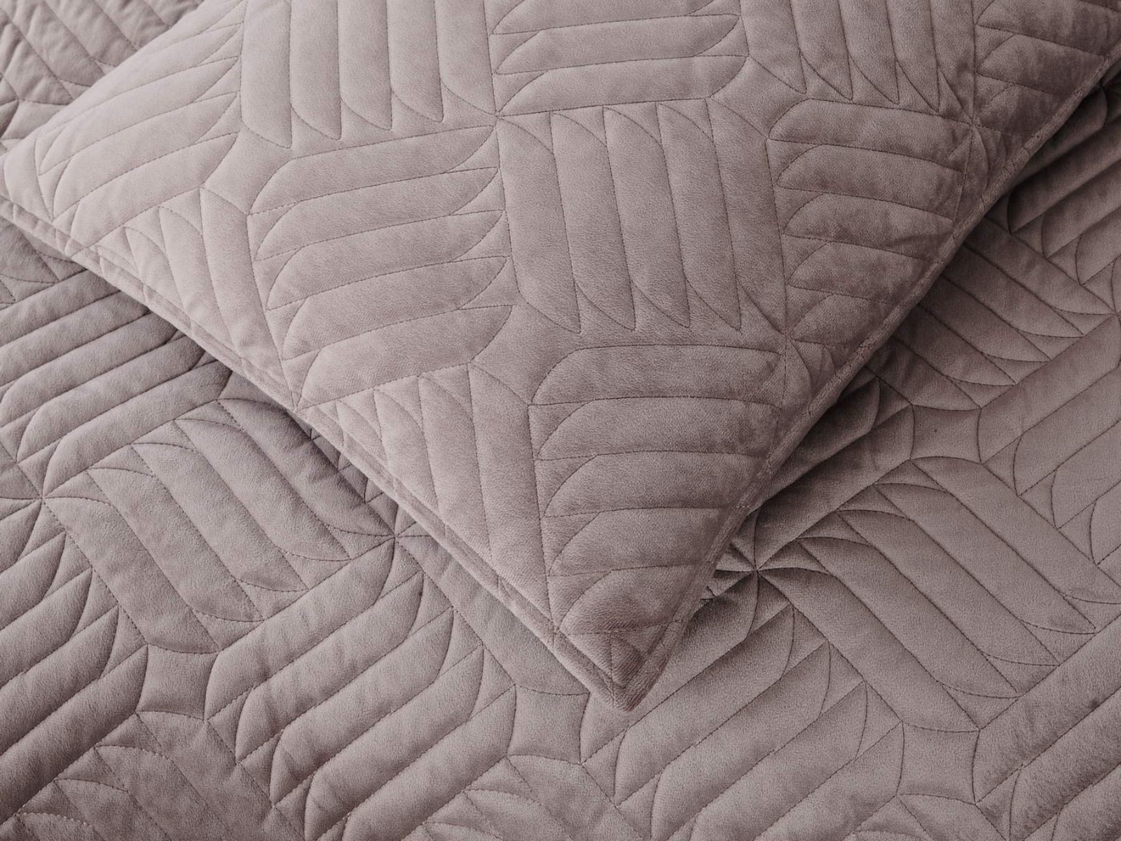 Покрывала выполнены в 10 оттенках: крем, мокко, пепельный, песочный, светло-бежевый, светло-серый, серый, темно-серый, чайная роза и черный. Стежка в виде геометрического орнамента подойдет к любому современному интерьеру. Из-за особого плетения, велюровая ткань покрывала отражает свет и красиво переливается при различном освещении.