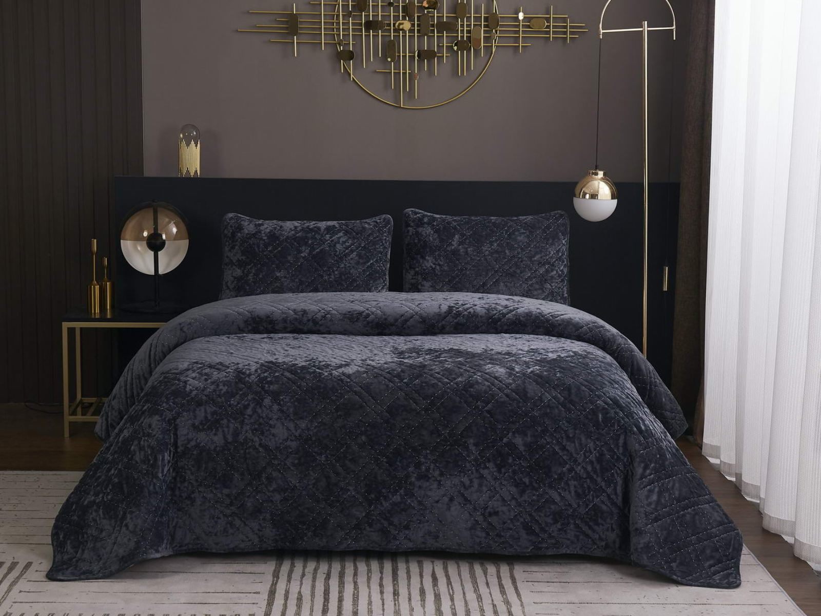 Покрывало Селена выполнено в девяти оттенках: пудра, антрацит, беж, изумруд, капучино, пепел роза, серебро, стоун, терракот. Они подойдут практически для любого интерьера, от классического, до модерна или романтического. Стеганое бархатное покрывало будет необыкновенно смотреться на вашей постели. В комплект входят покрывало и одна либо две наволочки (50х70 см) из аналогичного материала в зависимости от размера.