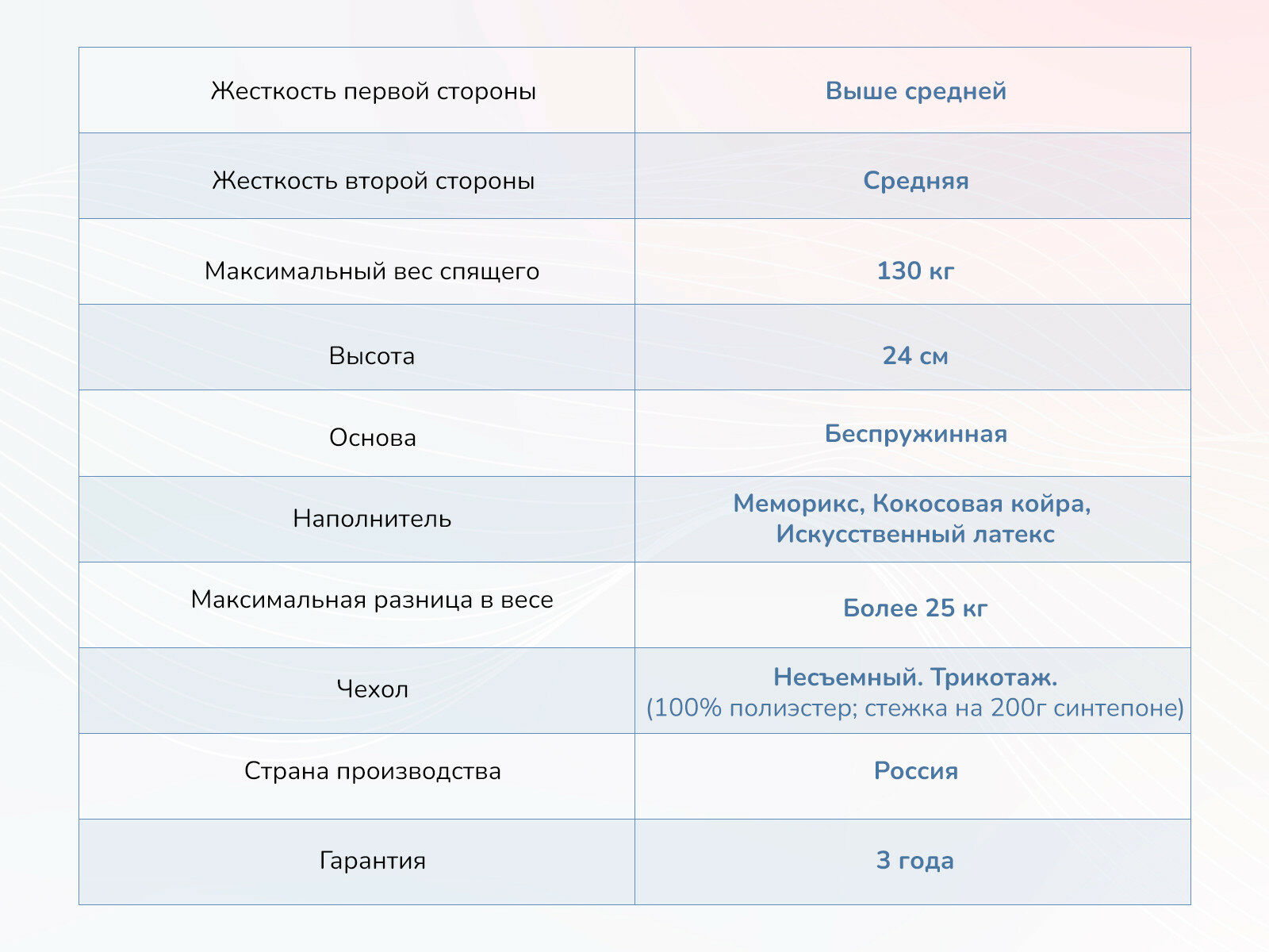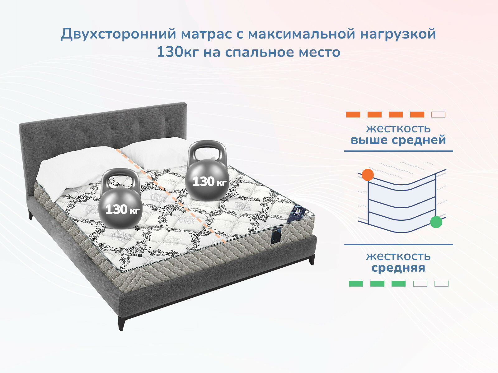 Эффект памяти формы позволяет матрасу подстраивается под потребности любого спящего, а скрученная упаковка и высокая нагрузочная способность делают его идеальным для переездов и жизни за городом.